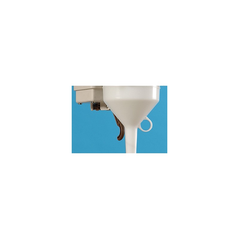 Variation de la vitesse de la gaveuse grâce au bouton fixé sur le boîtier d'alimentation. Garnissage du maïs facilité par une ouverture de la collerette de plus de 30 cm de diamètre; possibilité d'adapter plus tard une arrivée de maïs automatique. Légère, la gaveuse ne pèse pas plus de 4 kg et lorsqu'elle est garnie de maïs elle est bien équilibrée et toujours à l'aplomb du volatile.